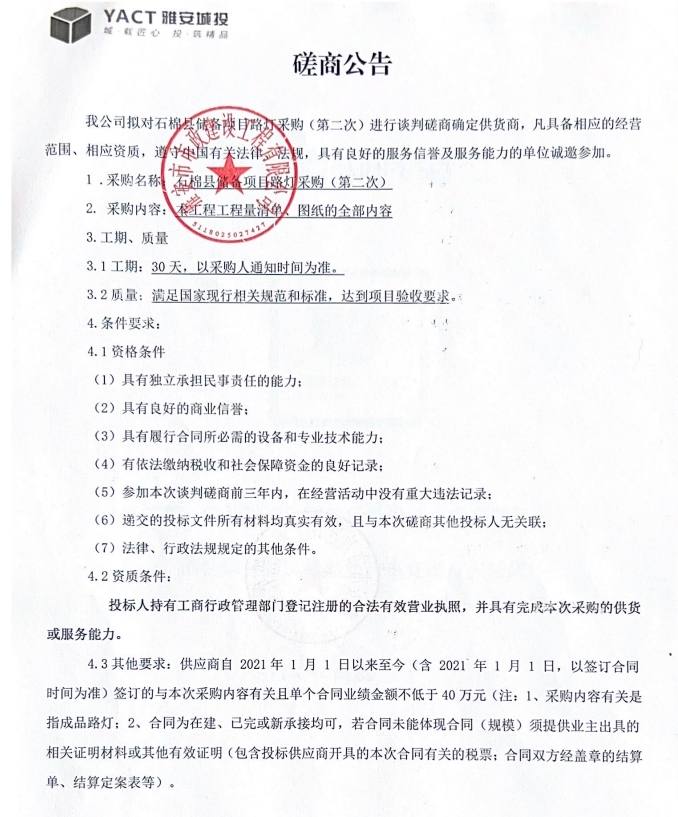 石棉縣儲備項目路燈采購(第二次)磋商公告