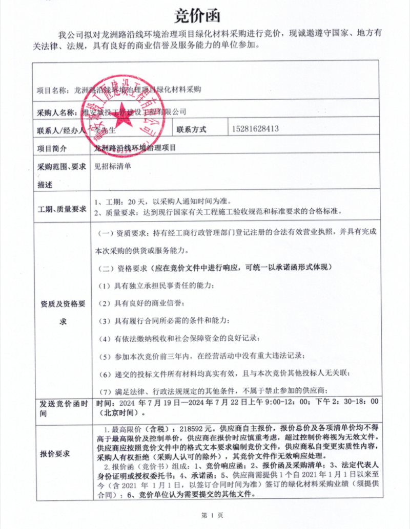 龍洲路沿線環(huán)境治理項(xiàng)目綠化材料采購競(jìng)價(jià)公告