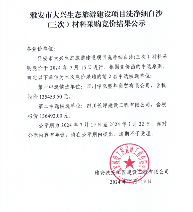 雅安市大興生態(tài)旅游建設(shè)項(xiàng)目洗凈細(xì)白沙(三次)材料采購(gòu)競(jìng)價(jià)結(jié)果公示