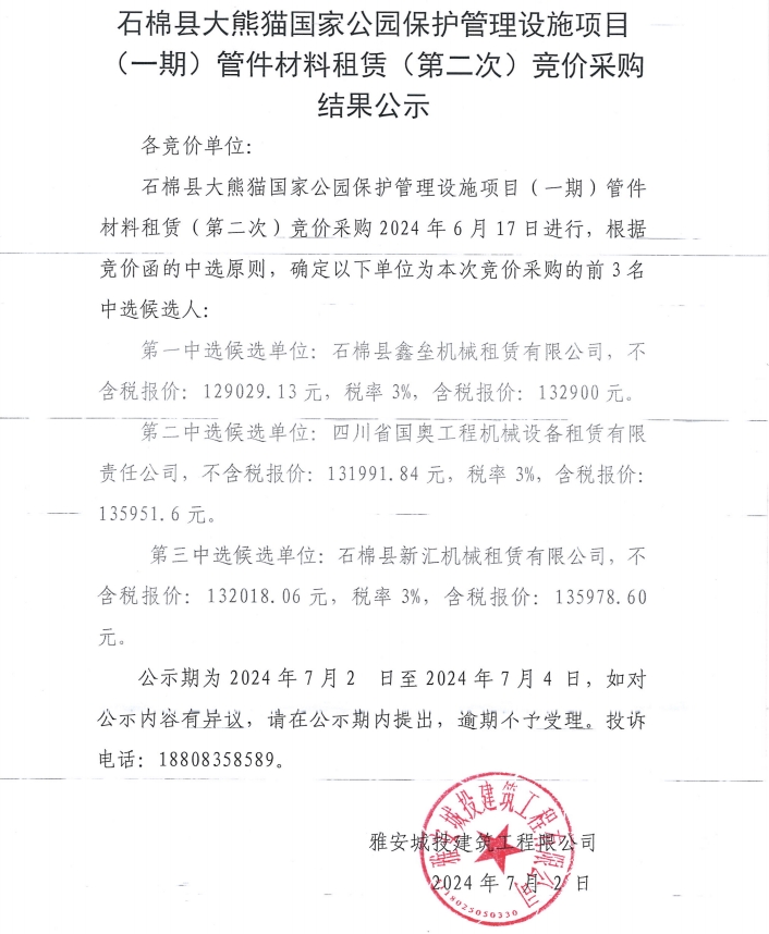 石棉縣大熊貓國家公園保護管理設施項目(一期)管件材料租賃(第二次)競價采購結(jié)果公示