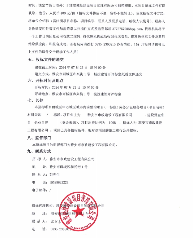 雅安市城區(qū)中心城市內(nèi)澇整治項目(一標(biāo)段)勞務(wù)分包服務(wù)項目(項目名稱)材料采購招標(biāo)公告
