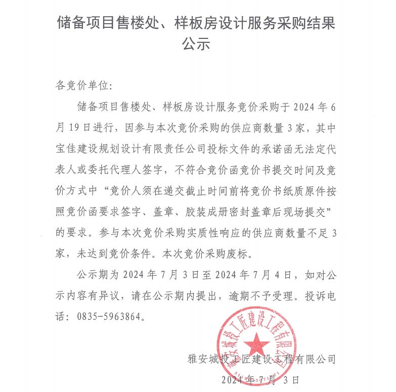 儲備項目售樓處、樣板房設(shè)計服務(wù)采購結(jié)果公示