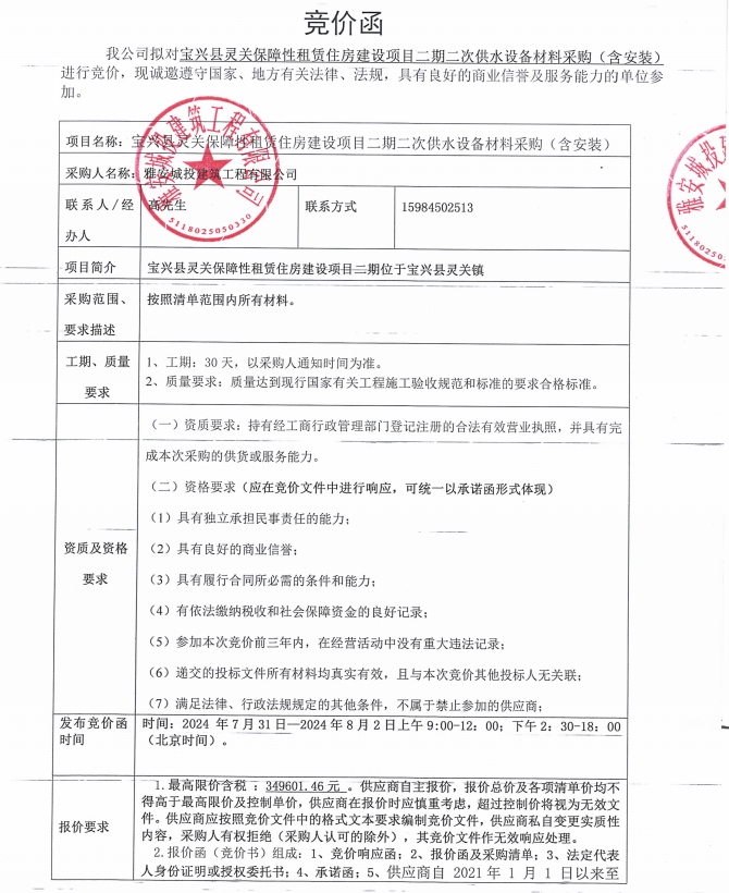 寶興縣靈關(guān)保障性租賃住房建設(shè)項目二期二次供水設(shè)備采購(含安裝)競價公告