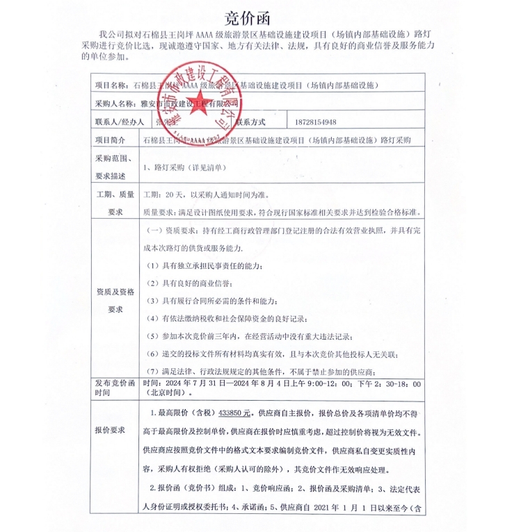 石棉縣王崗坪AAAA級旅游景區(qū)基礎(chǔ)設(shè)施建設(shè)項目(場鎮(zhèn)內(nèi)部基礎(chǔ)設(shè)施)路燈采購競價公告