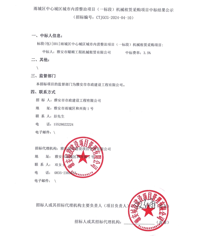 雨城區(qū)中心城區(qū)城市內(nèi)澇整治項(xiàng)目(一標(biāo)段)機(jī)械租賃采購(gòu)項(xiàng)目中標(biāo)結(jié)果公示