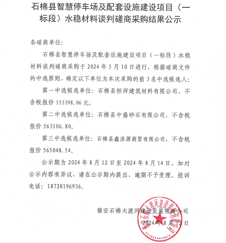 石棉縣智慧停車場(chǎng)及配套設(shè)施建設(shè)項(xiàng)目(一標(biāo)段)水穩(wěn)材料采購(gòu)談判磋商采購(gòu)結(jié)果公示