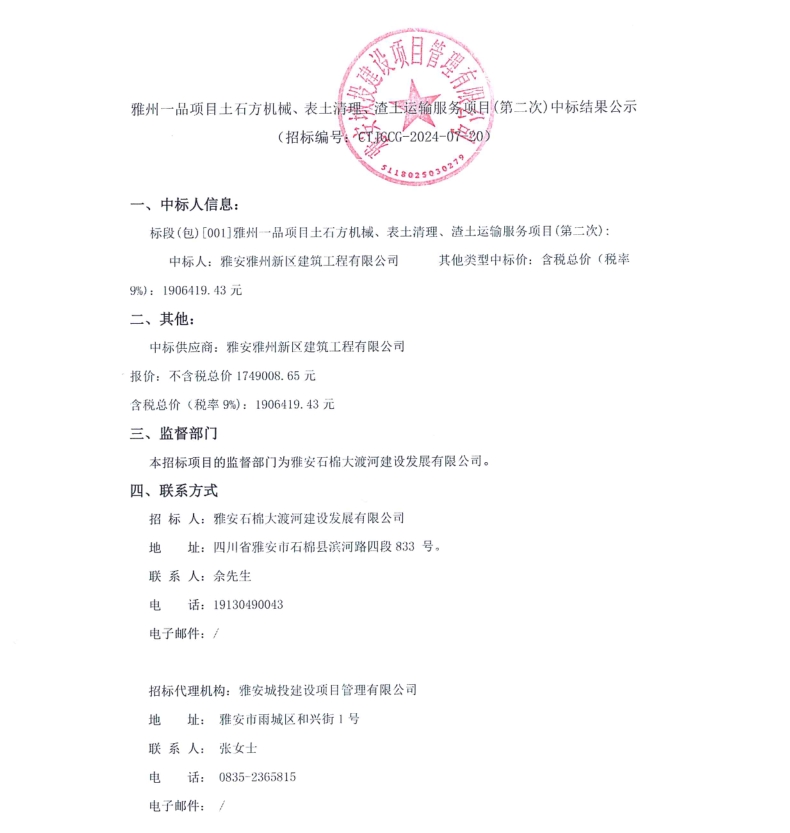 雅州一品項目土石方機械、表土清理、渣土運輸服務項目(第二次)中標結(jié)果公示