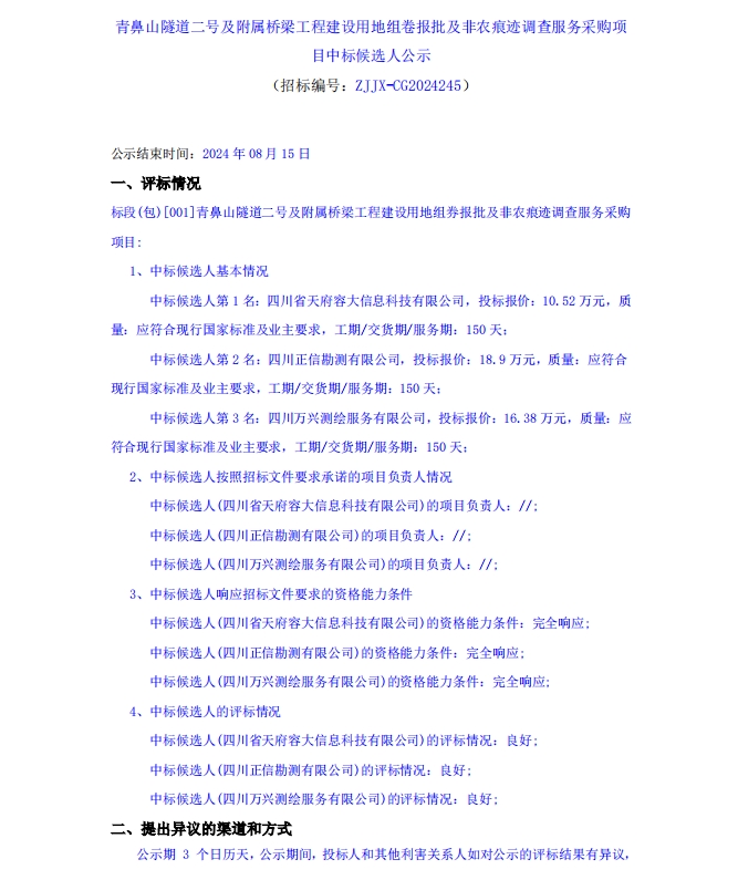 青鼻山隧道二號及附屬橋梁工程建設(shè)用地組卷報批及非農(nóng)痕跡調(diào)查服務(wù)采購項目中標(biāo)候選人公示
