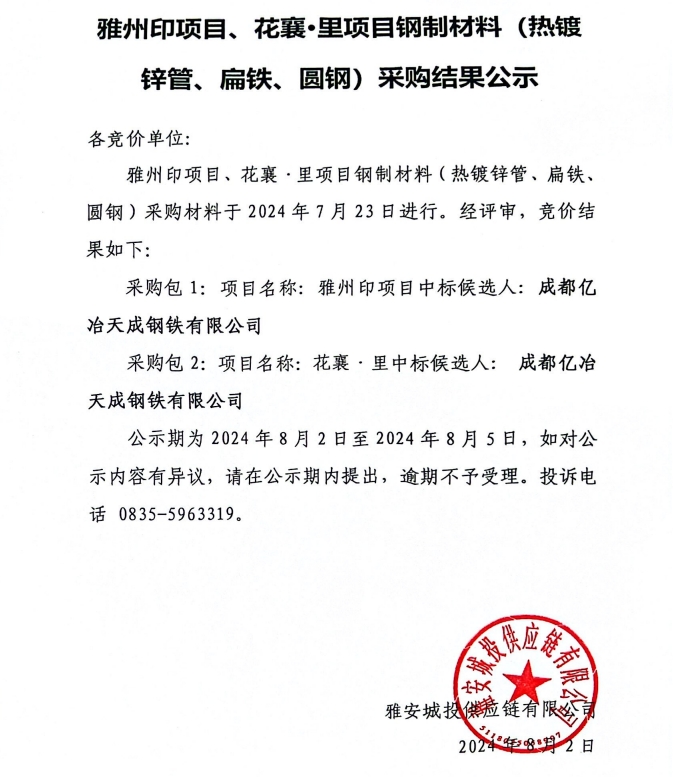 雅州印項目、花襄·里項目鋼制材料(熱鍍鋅管、扁鐵、園鋼)采購結(jié)果公示