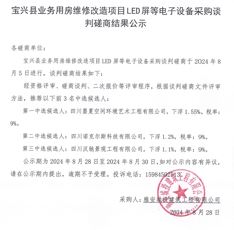 寶興縣業(yè)務(wù)用房維修改造項(xiàng)目LED屏等電子設(shè)備采購(gòu)磋商結(jié)果公示
