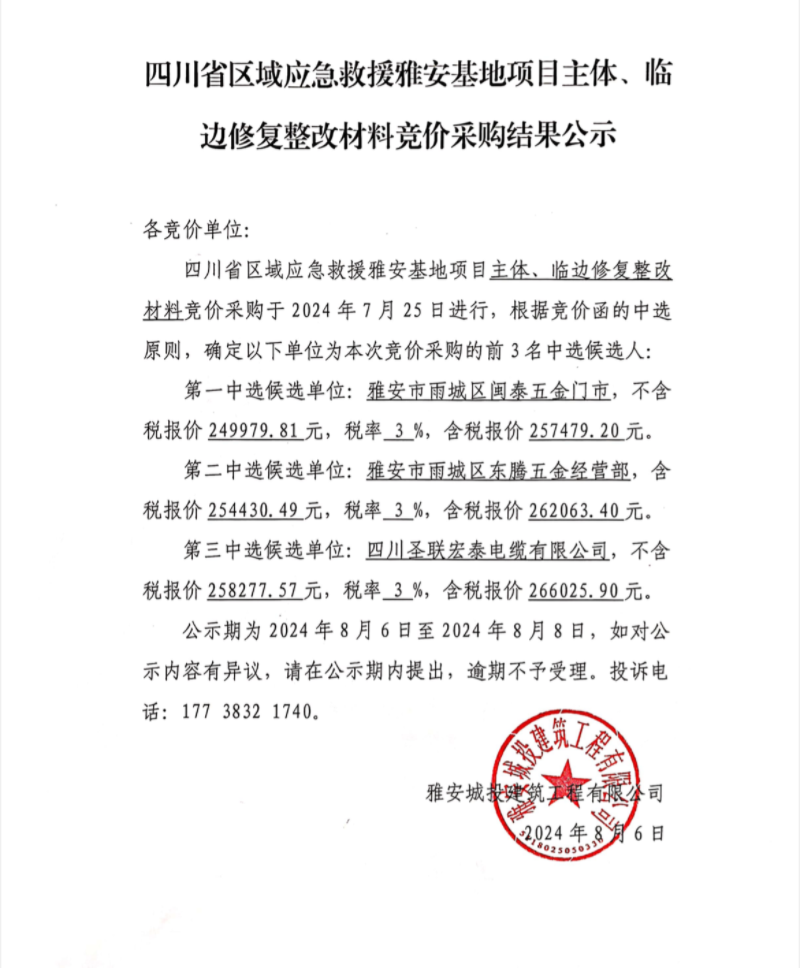 四川省區(qū)域應(yīng)急救援雅安基地項(xiàng)目主體、臨邊修復(fù)整改材料競價(jià)采購結(jié)果公示