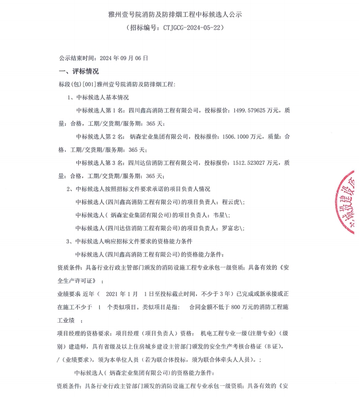 雅州壹號(hào)院消防及防排煙工程中標(biāo)候選人公示