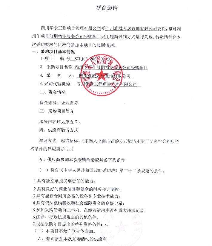 雅州印項目前期物業(yè)服務(wù)公司采購項目磋商邀請