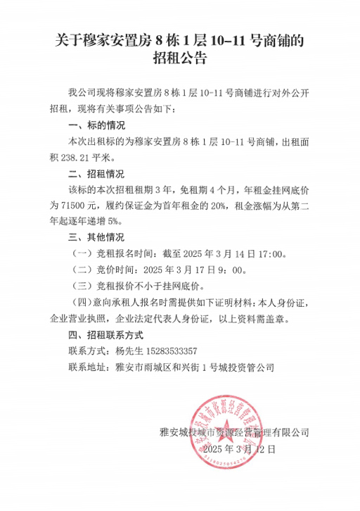 關(guān)于穆家安置房8棟1層10-11號(hào)商鋪的招租公告