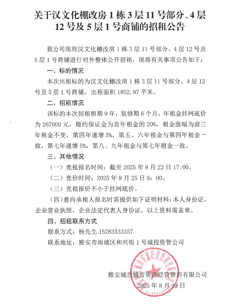 關(guān)于漢文化棚改房1棟3層11號(hào)部分、4層12號(hào)及5層1號(hào)商鋪的招租公告