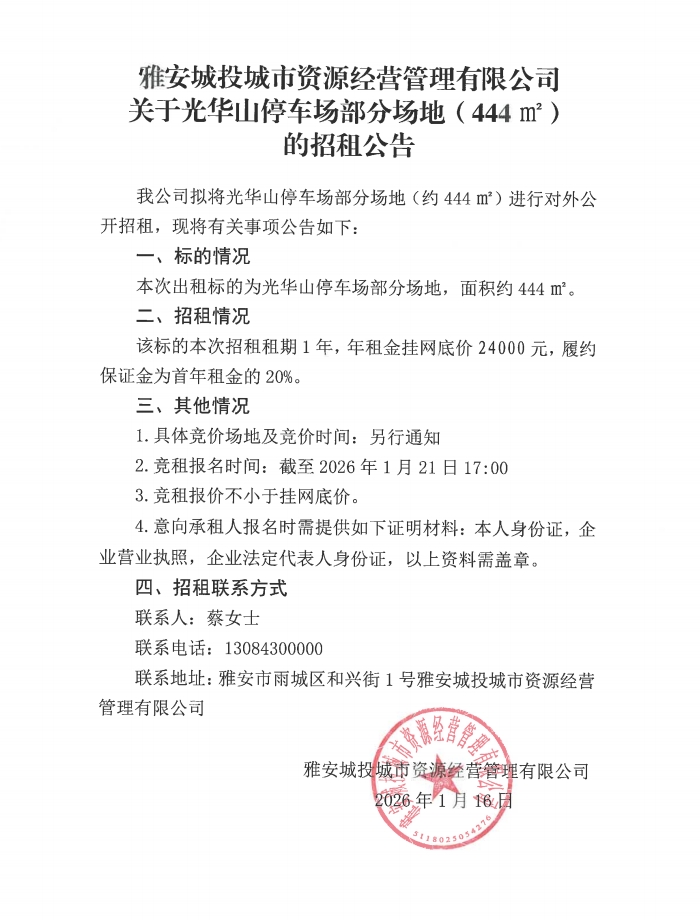 雅安城投城市資源經(jīng)營管理有限公司關于光華山停車場部分場地(444㎡)的招租公告