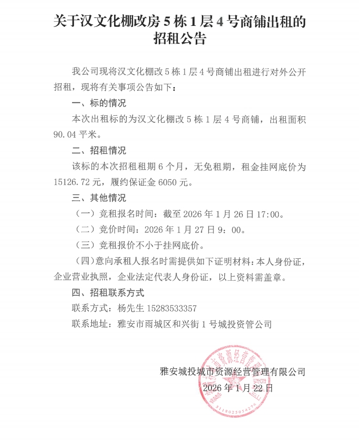 關(guān)于漢文化棚改房5棟1層4號商鋪出租的招租公告