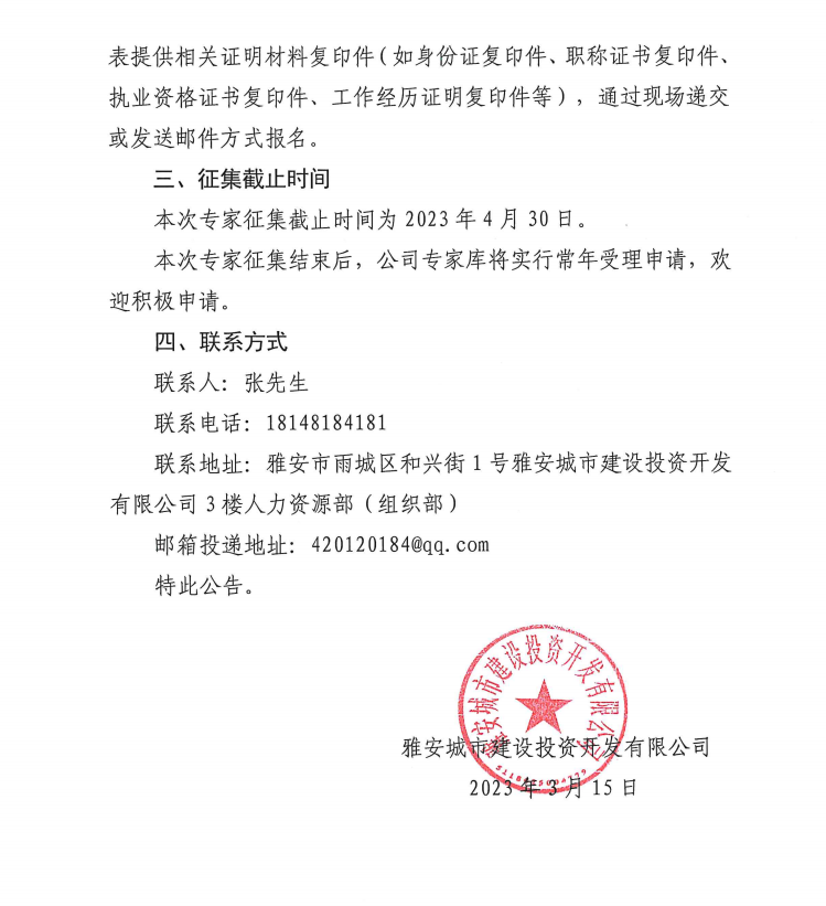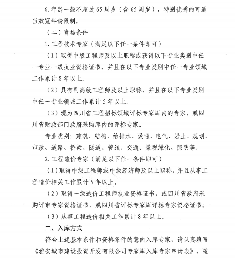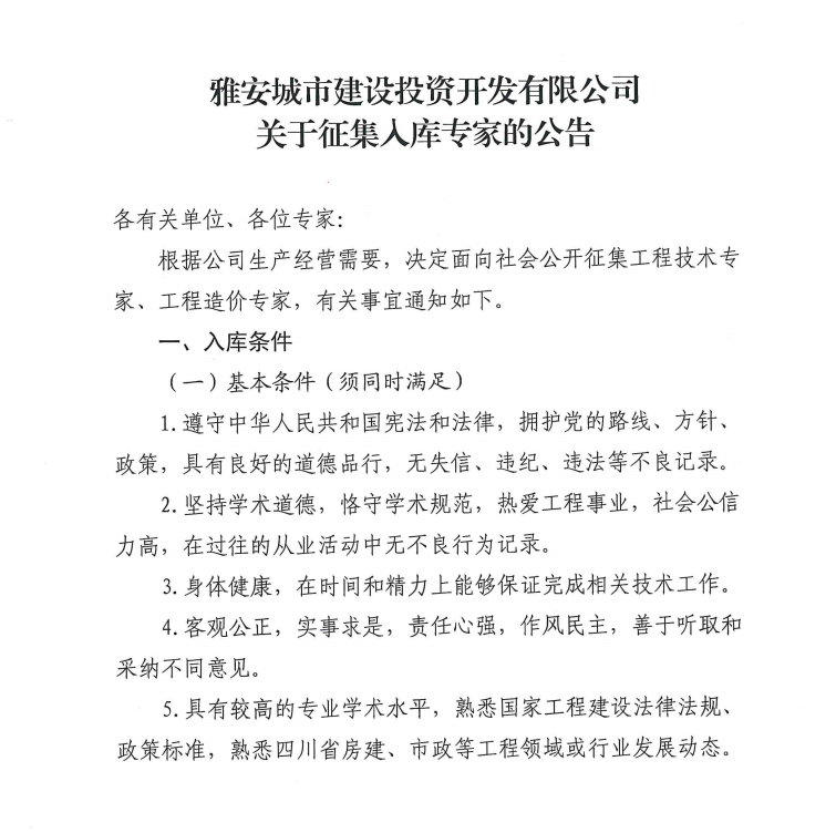雅安城市建設(shè)投資開(kāi)發(fā)有限公司關(guān)于征集入庫(kù)專家的公告