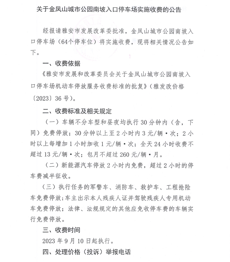關(guān)于金鳳山城市公園南坡入口停車場(chǎng)實(shí)施收費(fèi)的公告