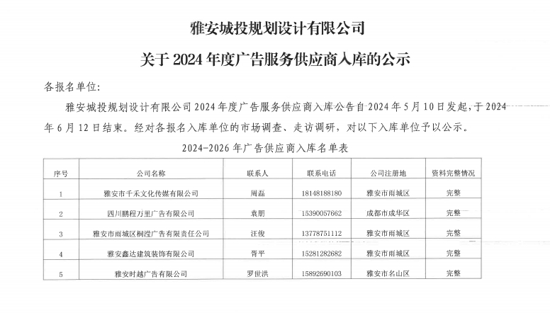 雅安城投規(guī)劃設計有限公司關于2024年度廣告服務供應商入庫的公示