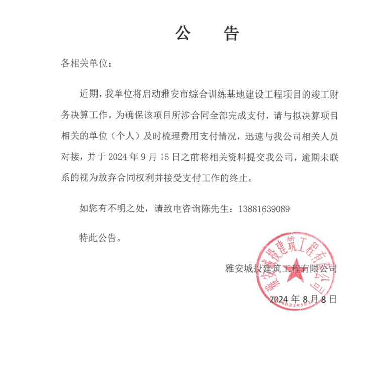 雅安市綜合訓(xùn)練基地建設(shè)項目決算公告